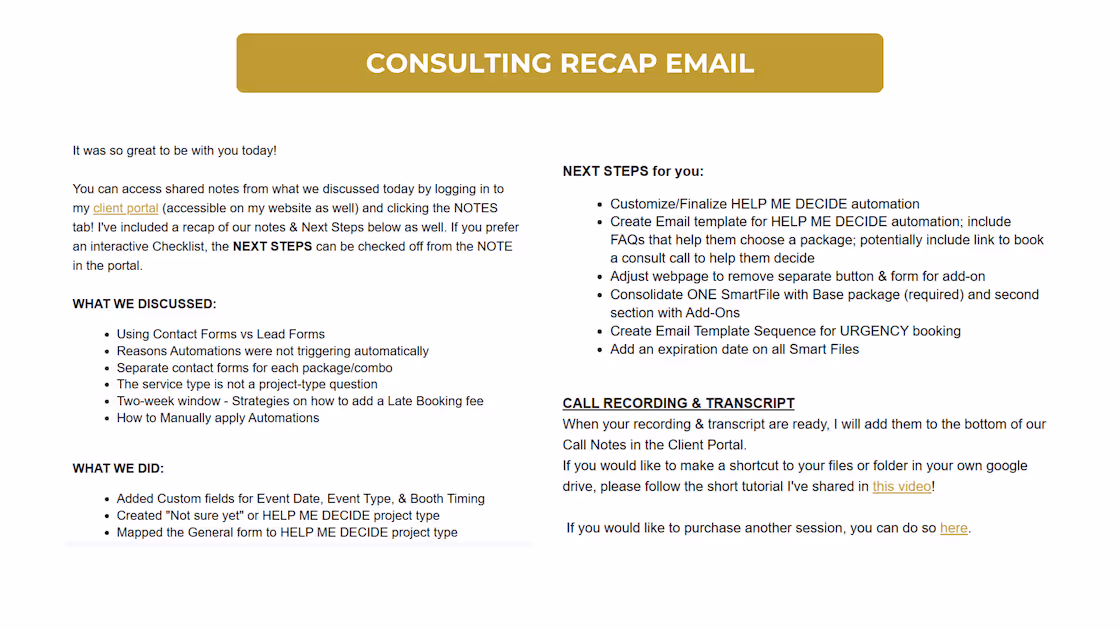 Finally, get your Honeybook issues solved! During this 50-minute session, we’ll get you some quick wins by troubleshooting or strategizing in your Honeybook account. You’ll complete a questionnaire ahead of time to ensure we focus on what you need. After our meeting, you’ll receive an email summary including next steps, a recording and transcript of the call, and if applicable, relevant resources.
